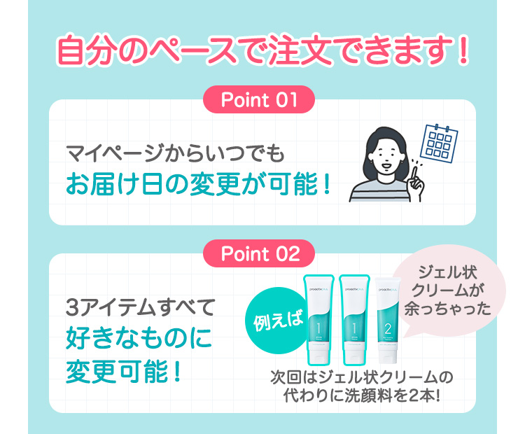 お使いの商品がちょうど無くなる頃に次の商品をお届けいたします(二回目の面倒なご注文は不要になります)。お届け商品・お届けサイクルの変更や、サービスの中止はマイページ・LINEにて承ります。 万が一、お肌に合わなかった場合には「安心の60日間返金保証」が、お客様を最後までサポートします。 詳しくはこちら
