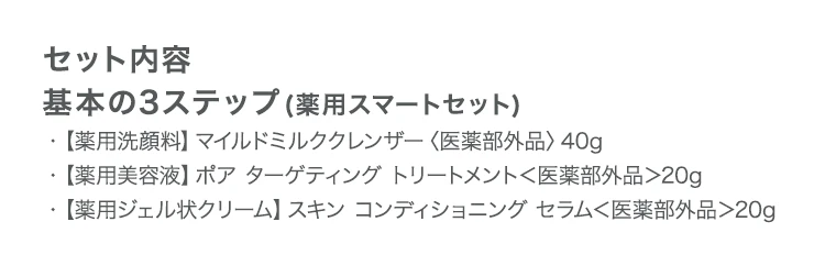 ▼セット内容・【薬用洗顔用】マイルドミルク クレンザー・【薬用美容液】ポア ターゲティング トリートメント・【薬用ジェル状クリーム】スキン コンディショニングセラム小計(税込): ¥1,980送料: ¥0お支払い金額: ¥1,980