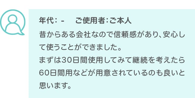 定期セットをご注文お客様は、便利でお得な「プロアクティブ定期便」に自動登録となります。(トライアルセットをご注文のお客様はプロアクティブ定期便への登録はありません) お使いの商品がちょうど無くなる頃に次の商品をお届けいたします(二回目の面倒なご注文は不要になります)。お届け商品・お届けサイクルの変更や、サービスの中止はマイページ・LINEにて承ります。 万が一、お肌に合わなかった場合には「安心の60日間返金保証」が、お客様を最後までサポートします。 詳しくはこちら